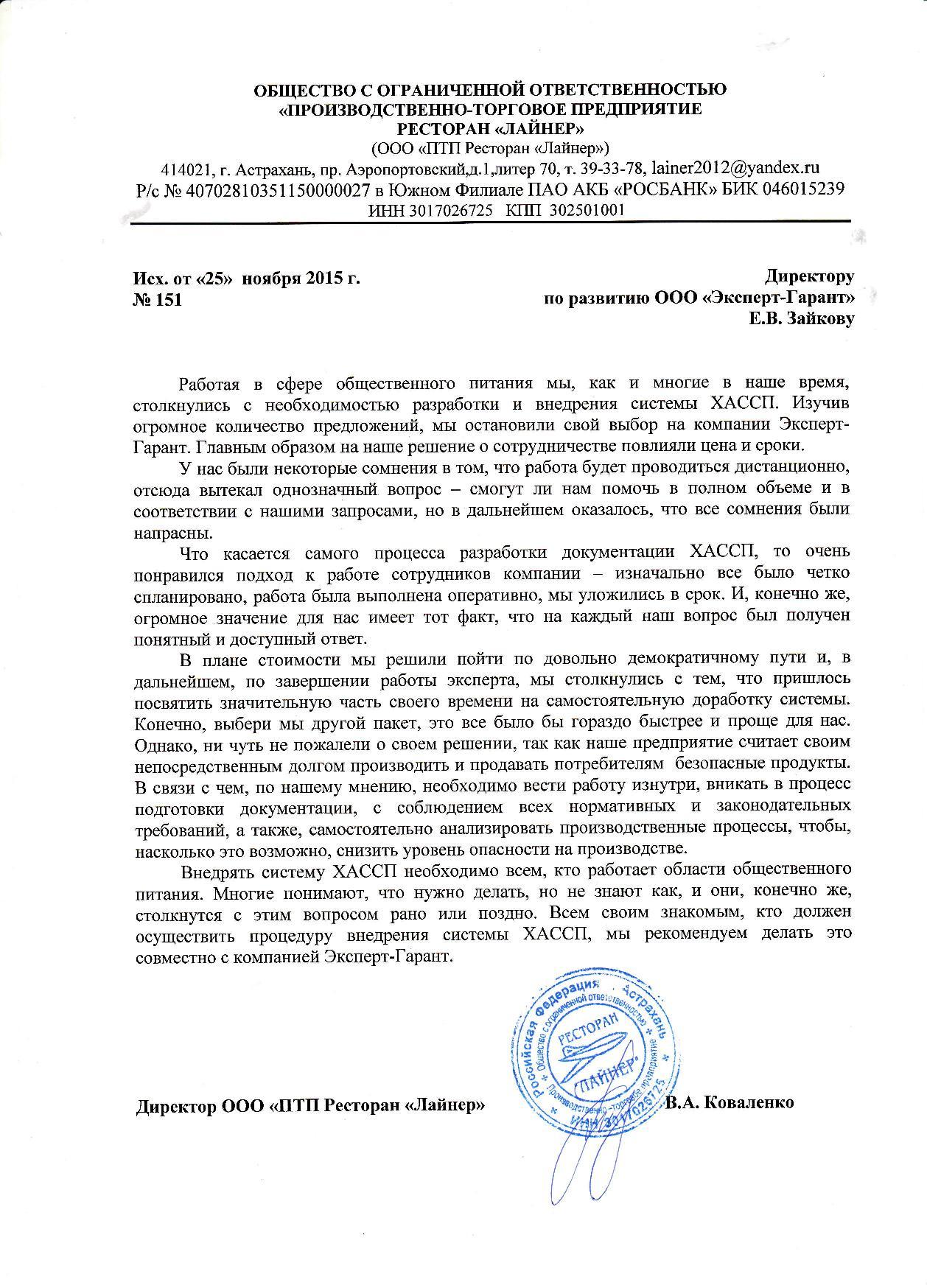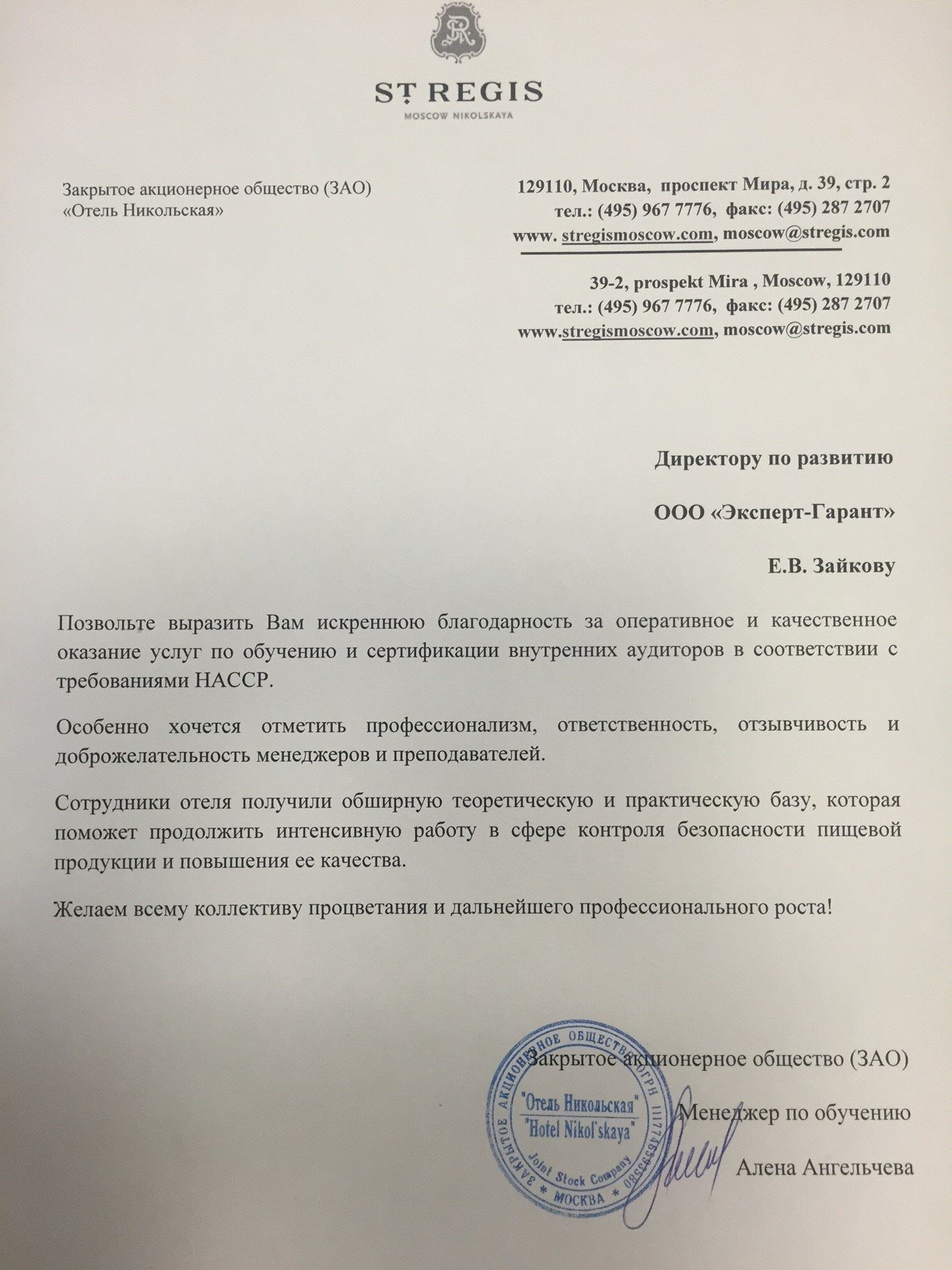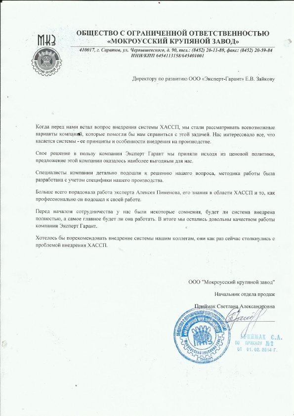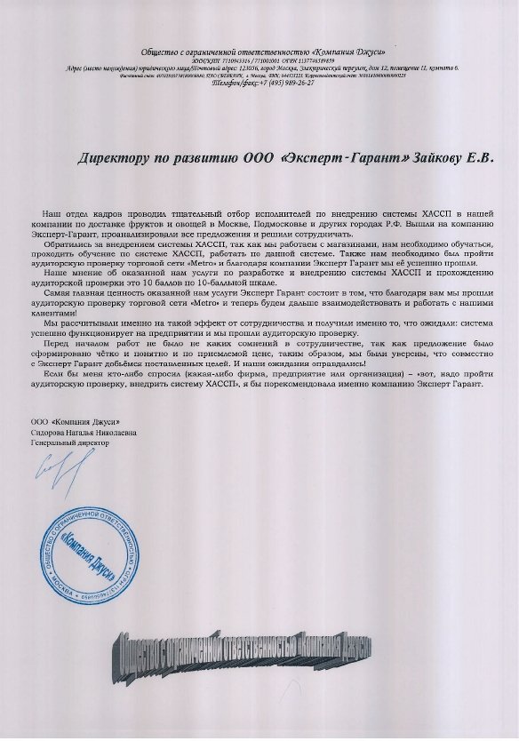 "Рекомендую тем предприятиям, у которых уже внедрена и функционирует система ХАССП, проводить сертификацию в компании Эксперт Гарант, так как, во-первых, это позволит оперативно пройти сертификацию, а во-вторых, получить дополнительный консалтинг по доработке и улучшению самой системы пищевой безопастности на предприятии"