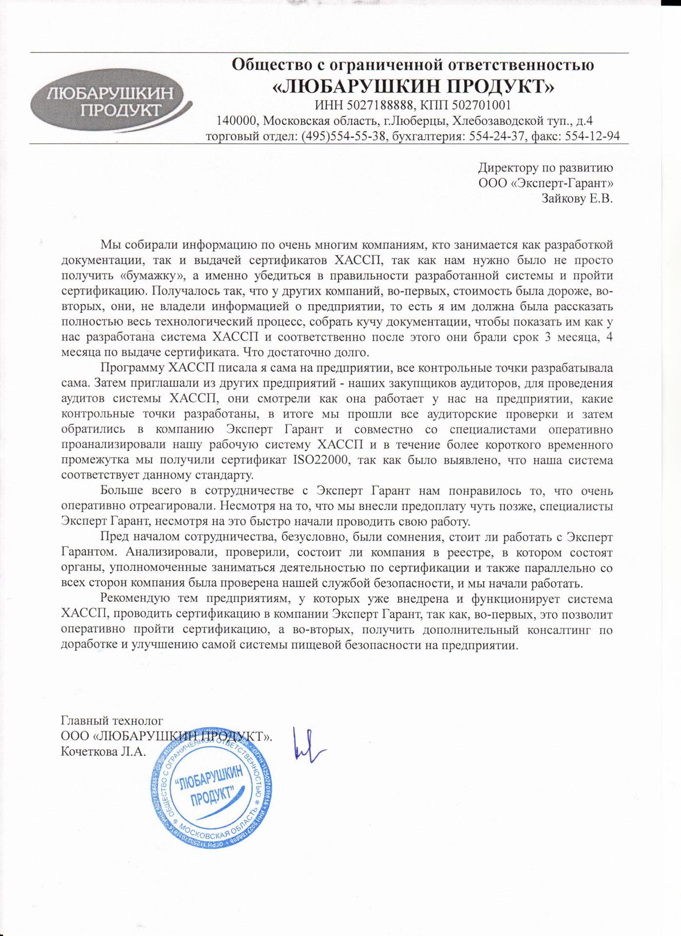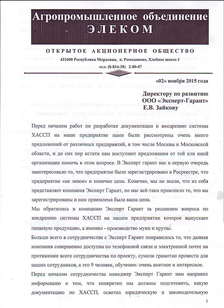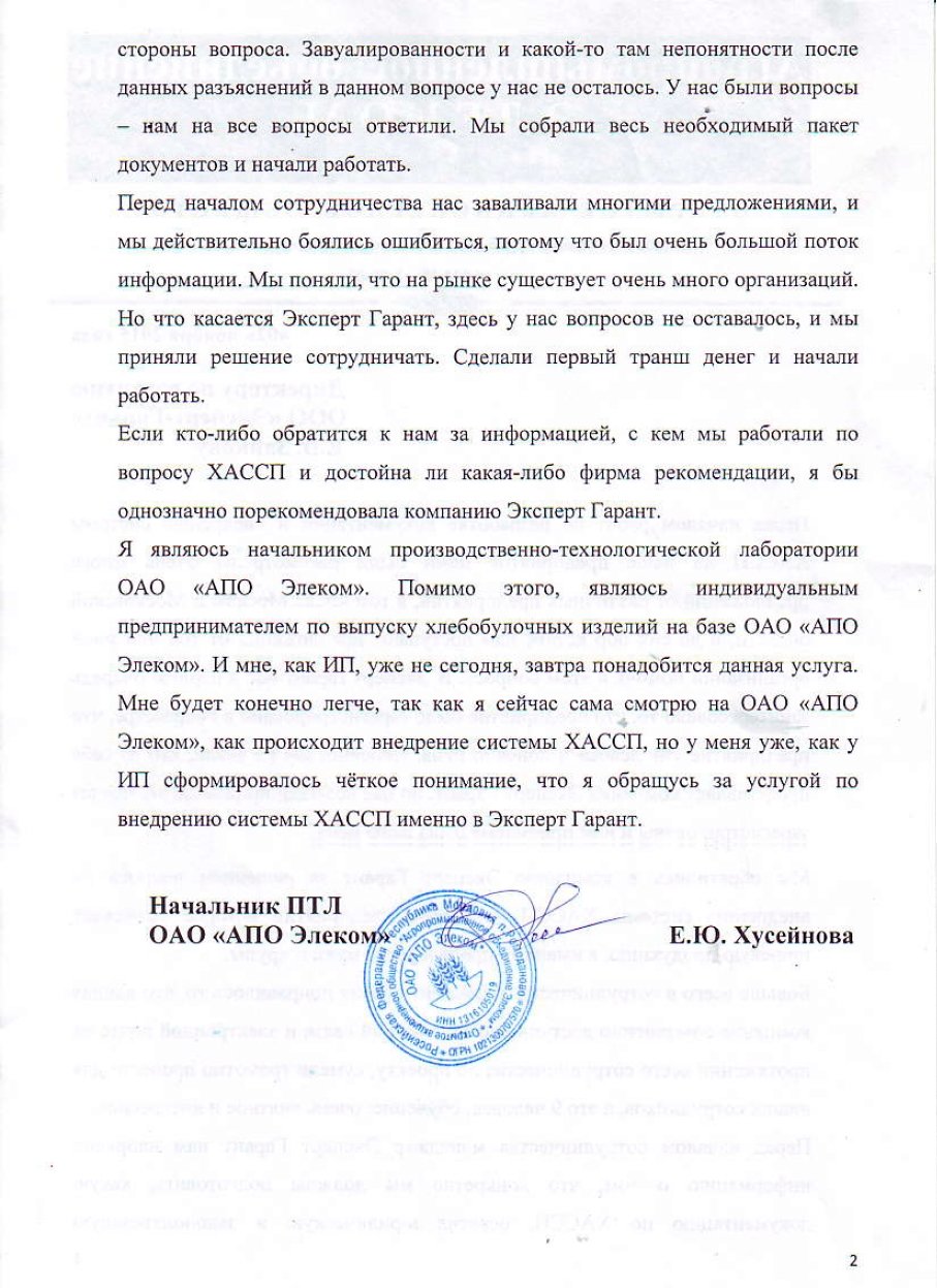"Рекомендую тем предприятиям, у которых уже внедрена и функционирует система ХАССП, проводить сертификацию в компании Эксперт Гарант, так как, во-первых, это позволит оперативно пройти сертификацию, а во-вторых, получить дополнительный консалтинг по доработке и улучшению самой системы пищевой безопастности на предприятии"